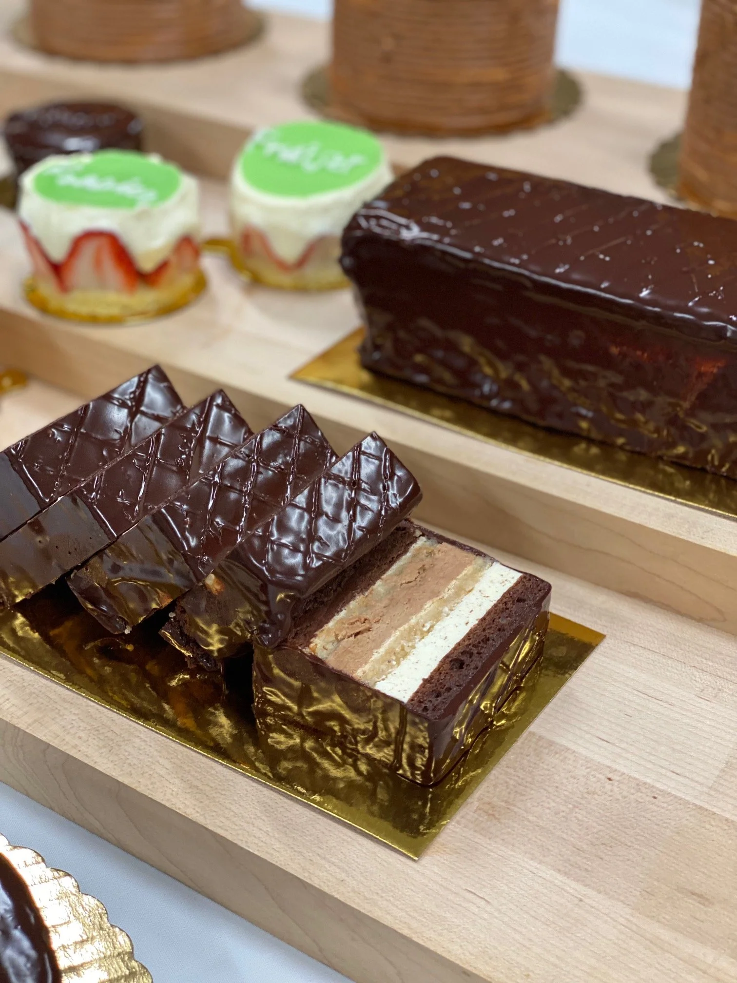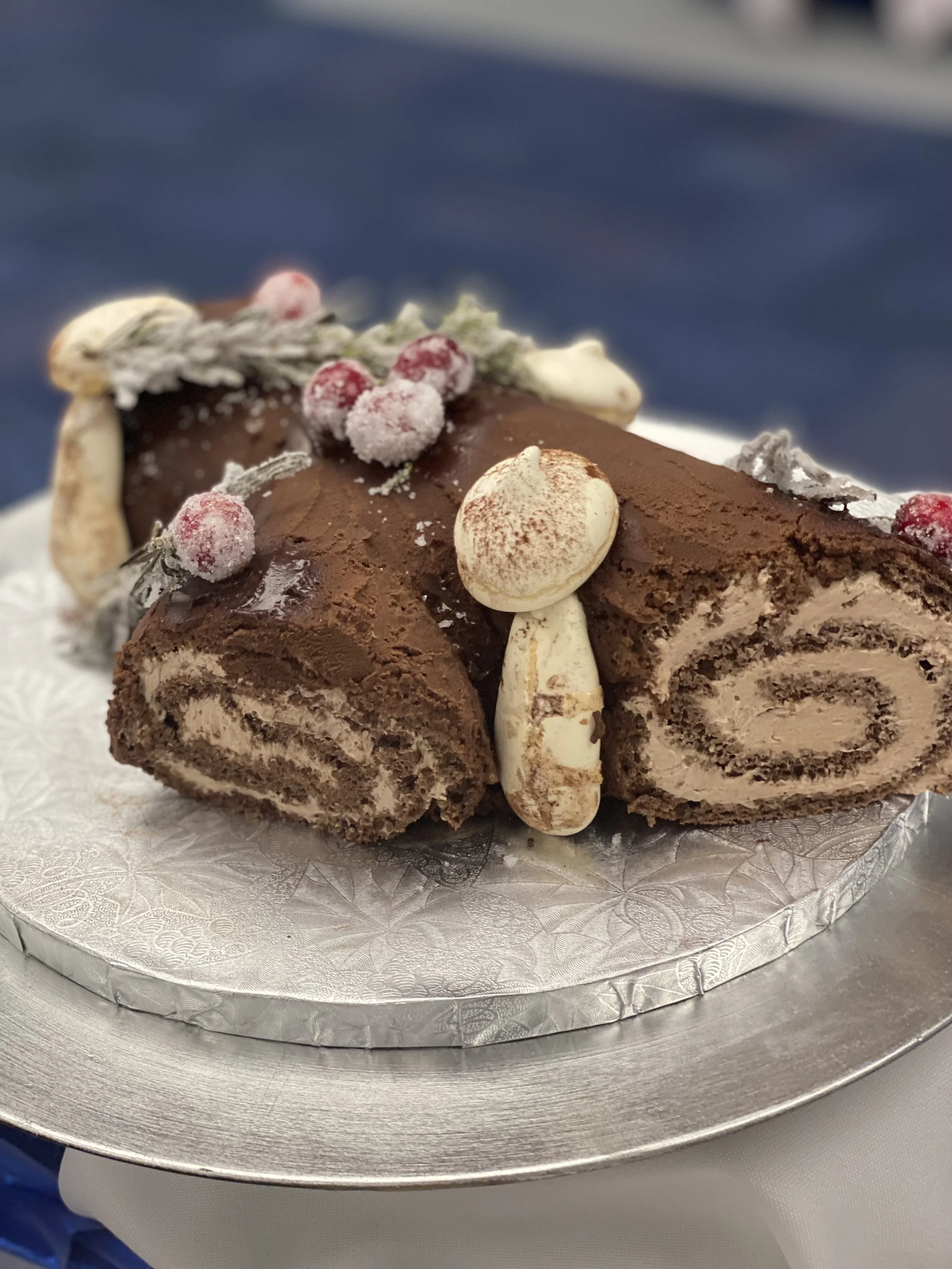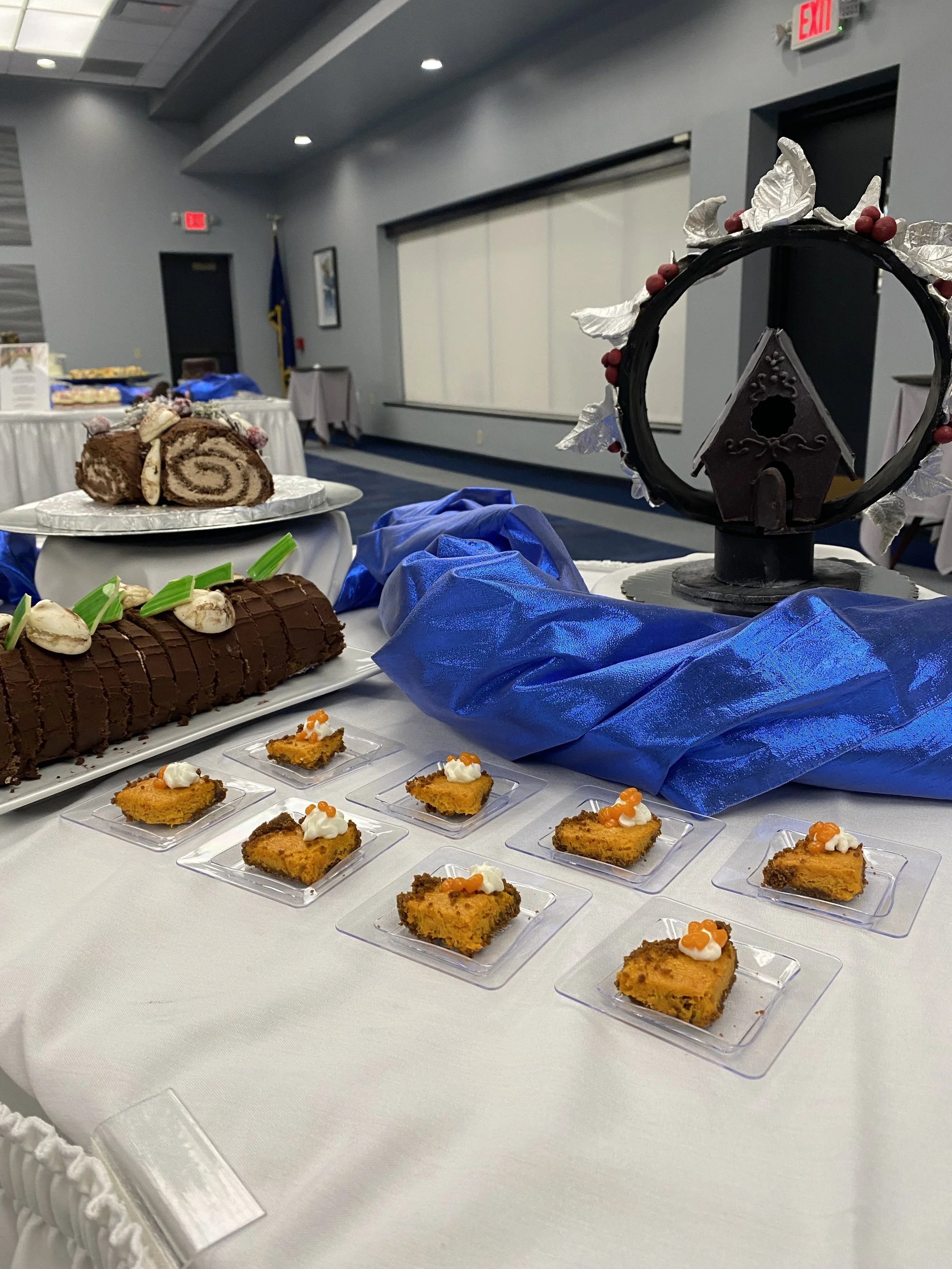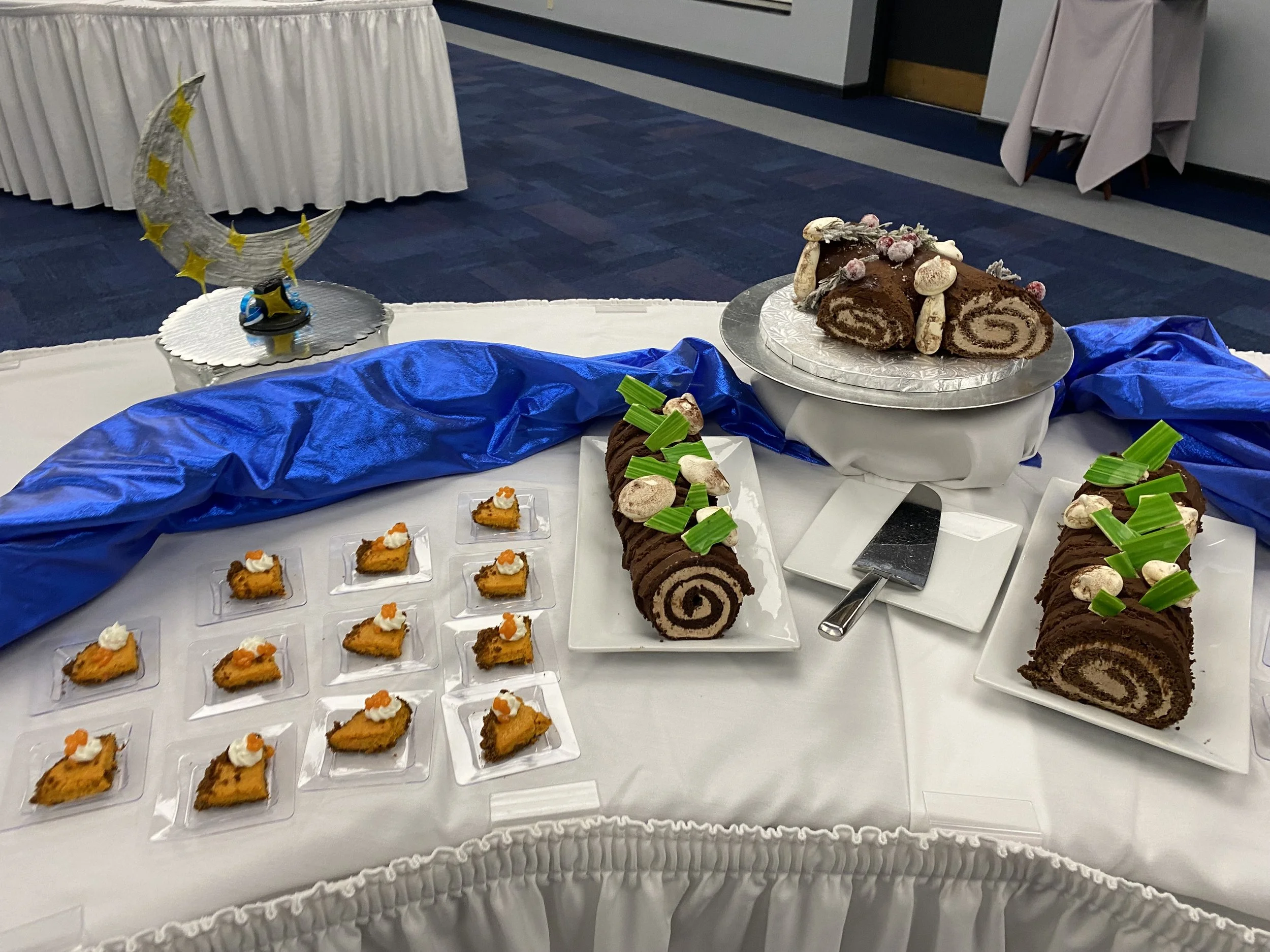 Buffet display (carrot ginger tart, sugar, showpiece, chocolate hazelnut swiss roll yule log)