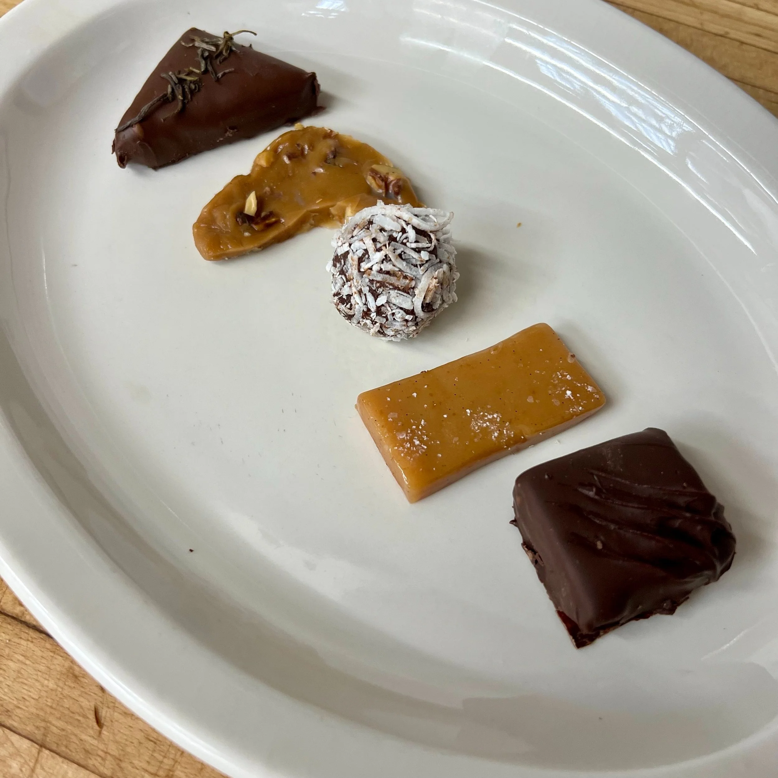 Confectionary Flight (Jasmine Green Tea Bonbon, Walnut Brittle, Lime Coconut Bonbon, Sea Salt Soft Caramel, Dark Chocolate ganache Bonbon)