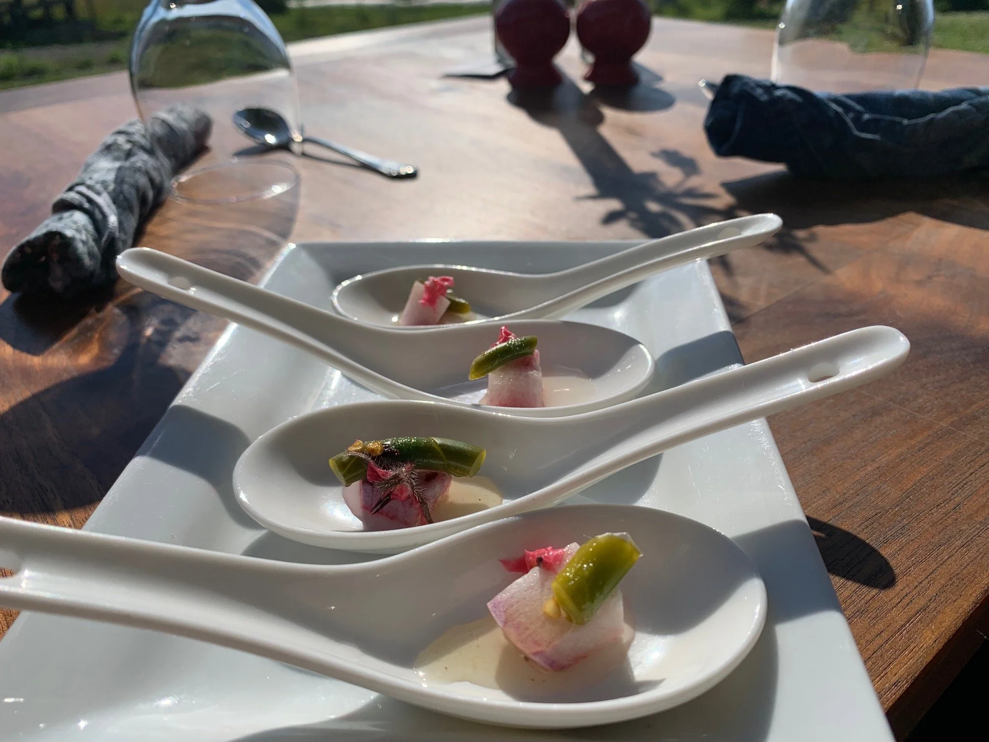 Daikon Radish, Pickled Garlic Scape & Borage Flower, in Sweet Chili Sauce
