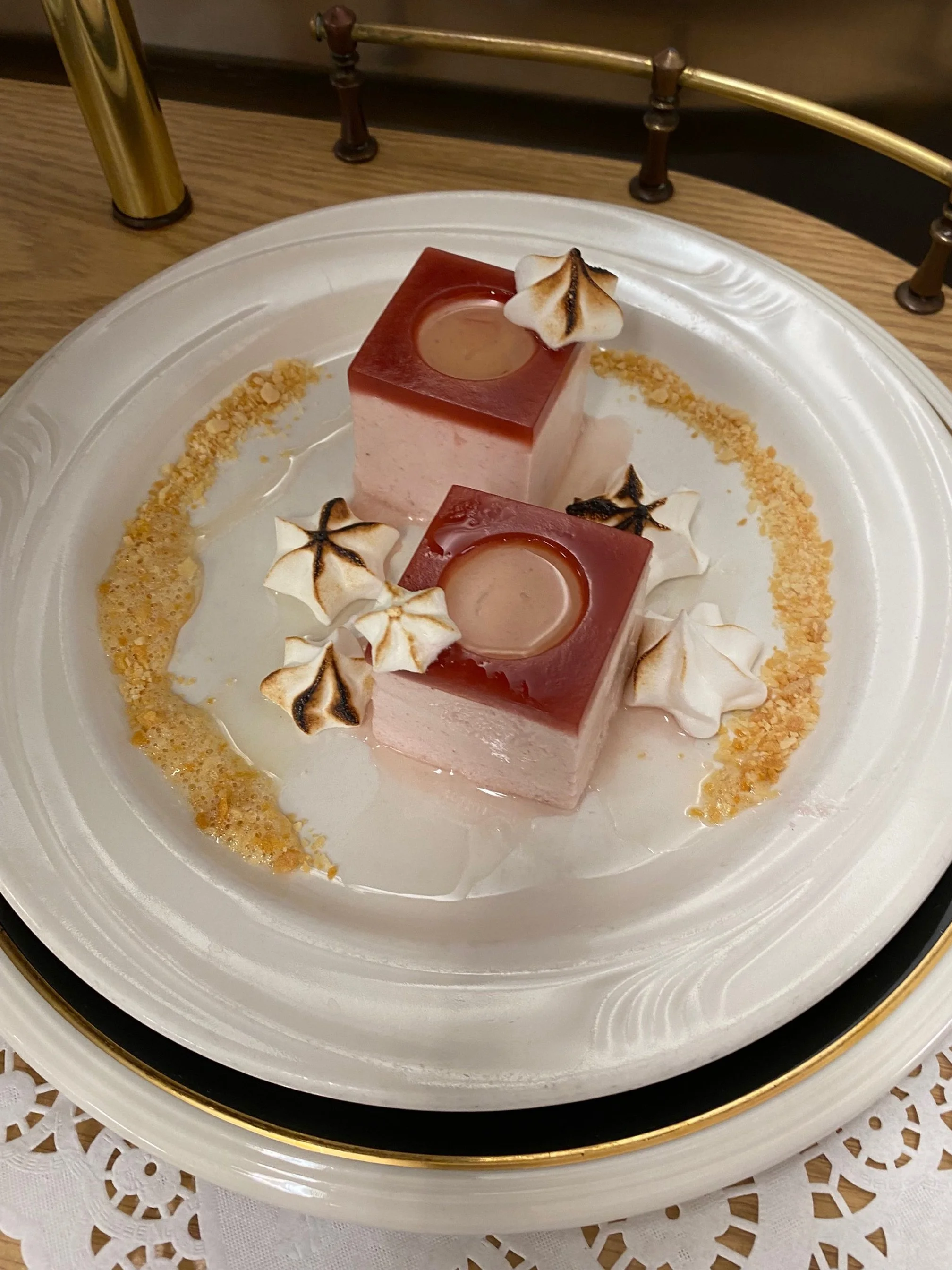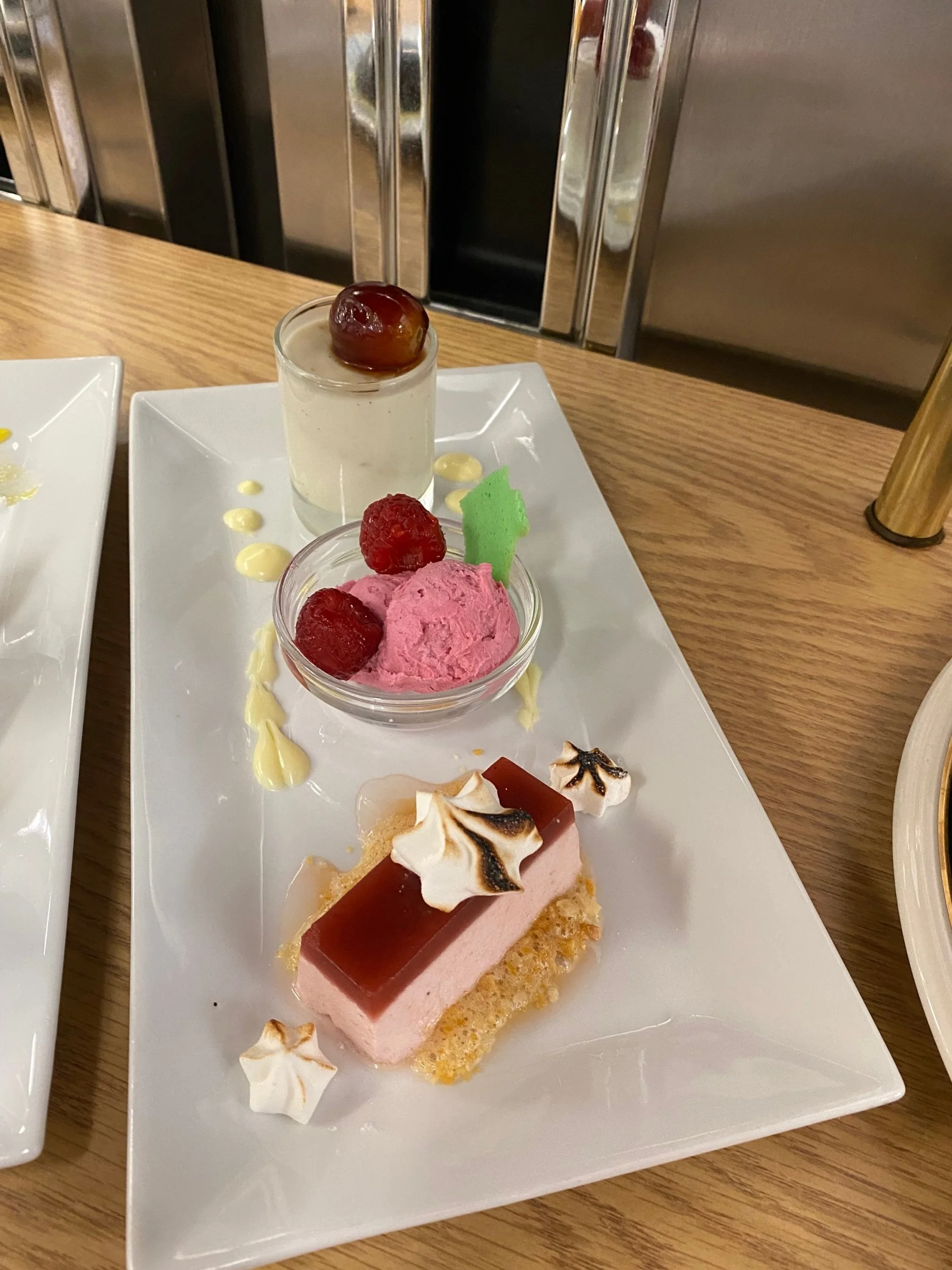 Grape Panna Cotta, Raspberry White Wine Sorbet, Strawberry Champagne Mousse (Work shown is class work)