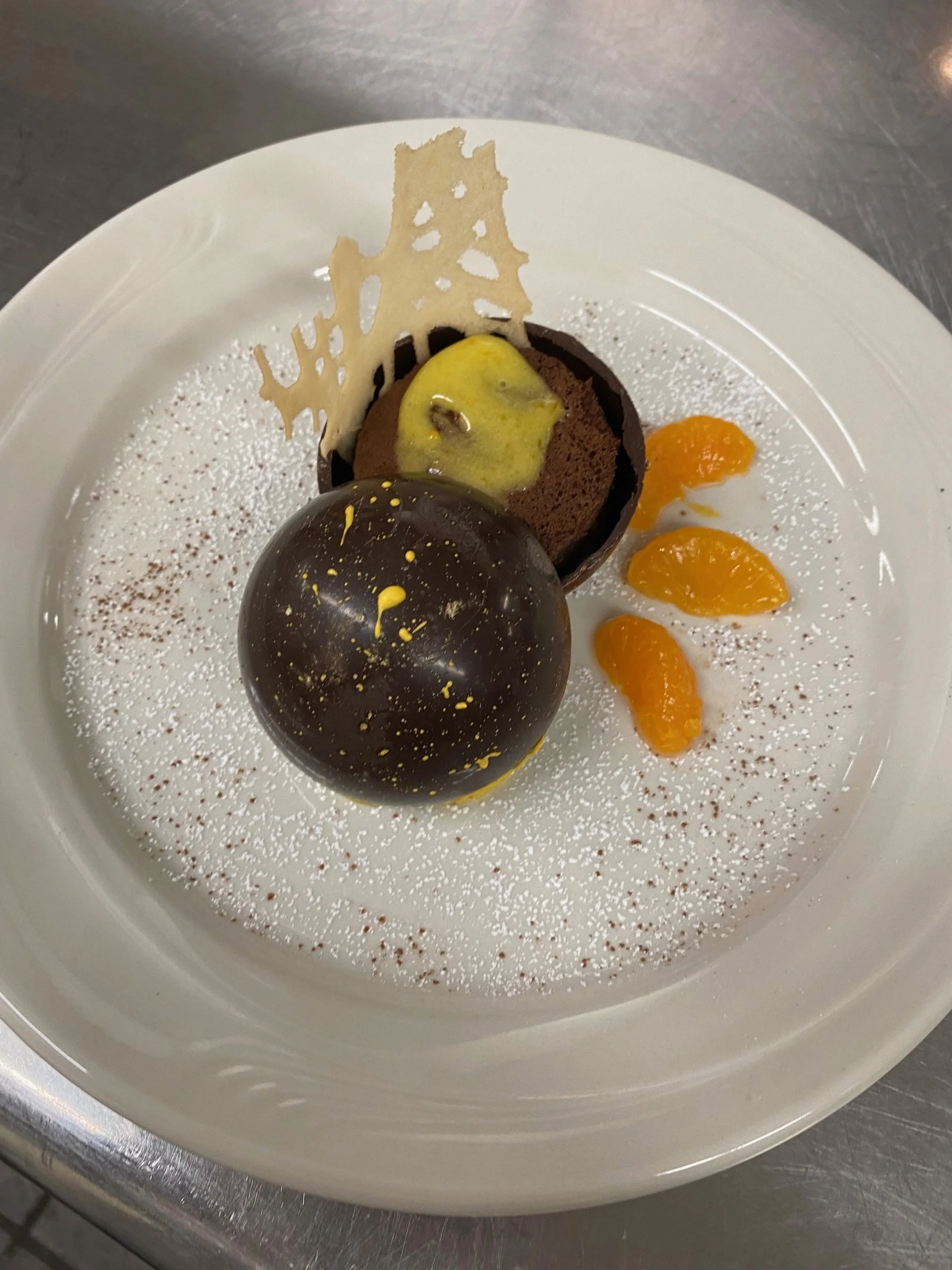 Buffet display (chocolate showpiece, carrot ginger tart, chocolate hazelnut swiss roll)